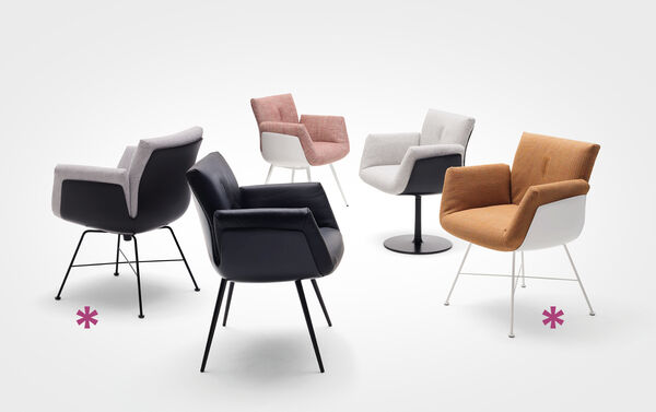 Superbequemer Stuhl-Sessel-Hybrid, weiche Sitzpolster, viele Varianten. NEU mit Drehfunktion 360?Drahtgestell-Fuß (links im Bild). AKTION "5+1" » 6 Stühle kaufen, nur 5 bezahlen! * Gilt für Drahtgestell drehbar oder fix.