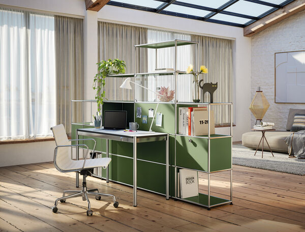 USM Modulmöbel jetzt im neuen Farbton Olivgrün! Schafft eine positive Atmosphäre, ideal auch in Kombination mit weißen Elementen. Unsere herausragend guten USM-Systemmöbel lassen sich jederzeit ganz nach Lust und Laune für neue Anforderungen umgestalten! So wird Ihr Ambiente und Ihr Office noch flexibler. Hochwertig und nachhaltig maßgefertigt in der Schweiz. Eine Ikone moderner Gestaltungskunst, ausgestellt im Museum of Modern Art.
