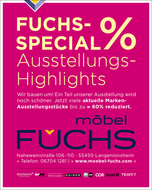 Sie suchen hochwertige Möbel in Rheinland-Pfalz, im Naheland, im Raum Bad Kreuznach, Bingen, Ingelheim, Mainz, Wiesbaden, Alzey, Idar-Oberstein? Dann sind Sie im Einrichtungshaus FUCHS genau richtig! Erleben Sie Fuchs live: Premium Massivholz-Möbel und Designermöbel nach Maß, Lack, Granit, Naturleder und edle Stoffe … Ihr Zuhause wird zum Unikat. Wohngenuss Tag für Tag. Lebensfreude garantiert!